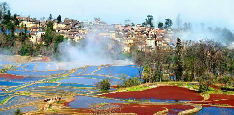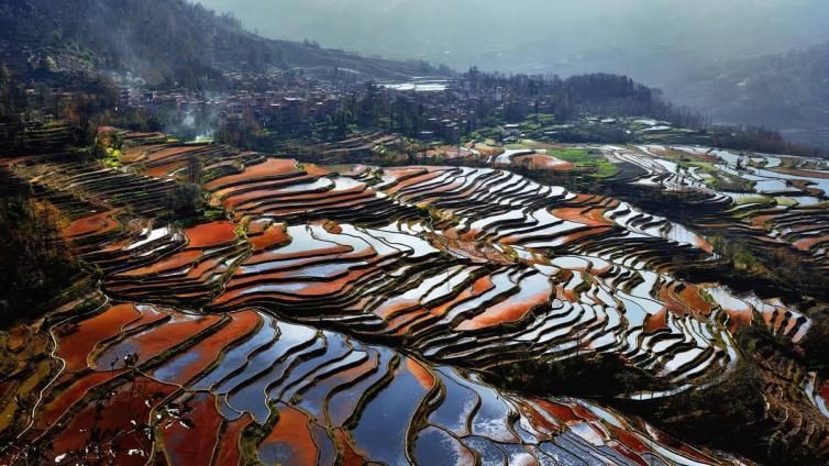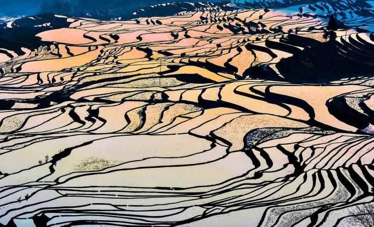 清晨,云层透出的阳光缓缓驱散弥漫田间的晨雾,那层层梯田便渐染金光,坐落其间的哈尼族彝族山寨,被云雾掩映得如梦如幻。等到大雾渐渐散去,梯田也慢慢露出本来“面目”,仿佛展开一幅幅流动的画卷。太阳出来之后,梯田随着光线变换着色彩,红色,绿色,蓝色,黄色在这里互相融合,犹如一块巨大的调色板,色彩层次极为丰富。