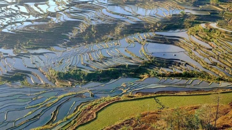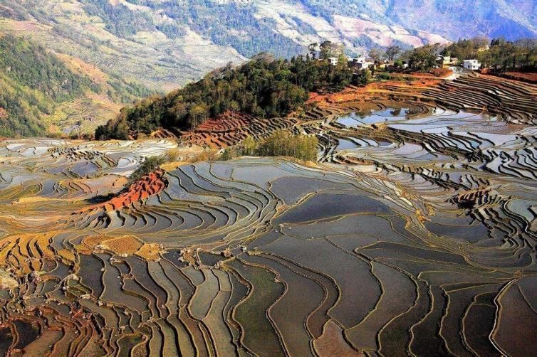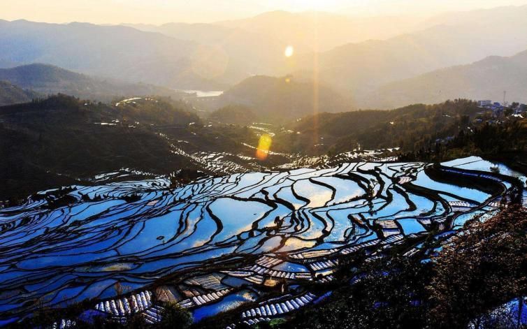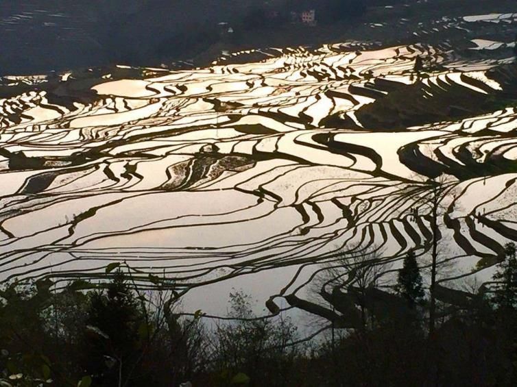 落日时分,当余晖洒向水面,整个梯田又多了几分绚烂璀璨,从金黄到火红,梯田好像使出浑身解数,要把今日最后的辉煌,留给人间。
