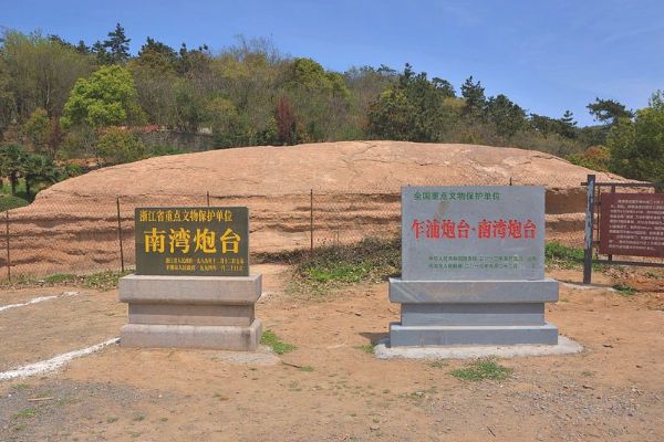 南湾炮台位于浙江省平湖市乍浦镇山湾村汤山之上,遗存混合土(糯米、明矾、石灰、砂等)浇筑炮台2座,配有机械装置后膛铁铸大炮1尊,总重约16、7吨,炮身上铸有“光绪戊子年(1888年)江南制造总局”铭文,除炮台表面风蚀剥落、铁炮部分构件损缺外,基本保存完整。