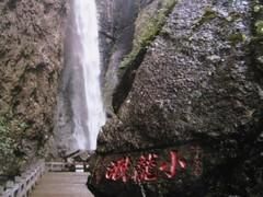而与之对应的是 灵岩景区中以小龙湫最为著名。小龙湫又名小瀑布,在南面的隐龙嶂底,是灵岩景区的主要观景之一。落差五十多米,悬崖环峙,岩腹有如珊瑚、玛瑙颜色。瀑飞崖上,触石腾空如雾团结旋;而流转飞洒,水珠溅人。瀑水搏潭,因光作色,形态万千。无怪前人有“我来看不足,长啸独凭栏”的赞叹!潭水从乱石间流出,汇合成卧龙溪,再蜿蜒地向南流入碧玉溪。溪里有一种不常见的黑背红肚子的小动物叫蛛螈,很是逗人喜爱。在小龙湫左侧山上,有猴子捧仙桃一景;卧龙溪中有鸭子戏水等景致,都值得一看。此外,潭前那一块长方形的大石头很像一方砚台,砚台旁边还靠着一块扁长方形的小石条,样子象一块松烟墨。