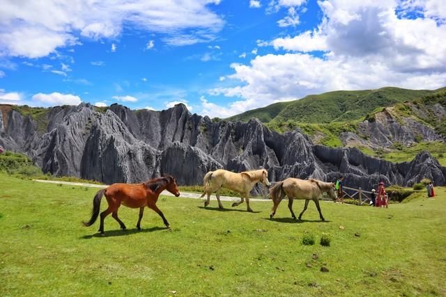 翻越垭口后一路顺势而下,我们抵达草原小镇八美镇,从这里开始,草原将一路相伴。沿着八美镇前行不远便是高原上的异域星球墨石公园。这些分布在断裂带上的黑色石林在草原中平地而起,置身其中,可以欣赏到难得一见的地质奇观,感叹大自然的神奇鬼斧。
