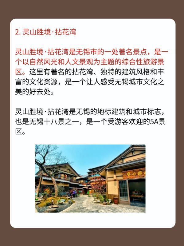 灵山胜境·拈花湾是无锡市的一处著名景点,是一个以自然风光和人文景观为主题的综合性旅游景区。这里有著名的拈花湾、独特的建筑风格和丰富的文化资源,是一个让人感受无锡城市文化之美的好去处。灵山胜境·拈花湾是无锡的地标建筑和城市标志,也是无锡十八景之一,是一个受游客欢迎的5A景区。
