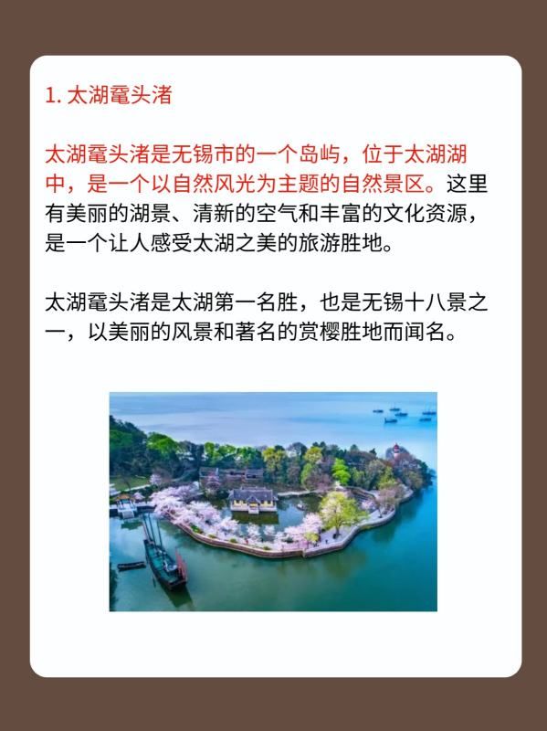 太湖鼋头渚是无锡市的一个岛屿,位于太湖湖中,是一个以自然风光为主题的自然景区。这里有美丽的湖景、清新的空气和丰富的文化资源,是一个让人感受太湖之美的旅游胜地。太湖鼋头渚是太湖第一名胜,也是无锡十八景之一,以美丽的风景和著名的赏樱胜地而闻名。