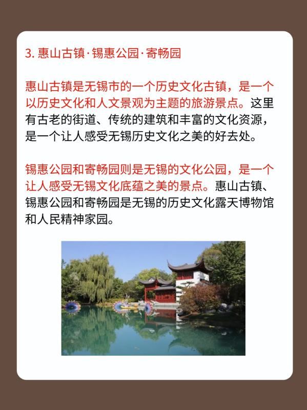 惠山古镇是无锡市的一个历史文化古镇,是一个以历史文化和人文景观为主题的旅游景点。这里有古老的街道、传统的建筑和丰富的文化资源,是一个让人感受无锡历史文化之美的好去处。锡惠公园和寄畅园则是无锡的文化公园,是一个让人感受无锡文化底蕴之美的景点。惠山古镇、锡惠公园和寄畅园是无锡的历史文化露天博物馆和人民精神家园。