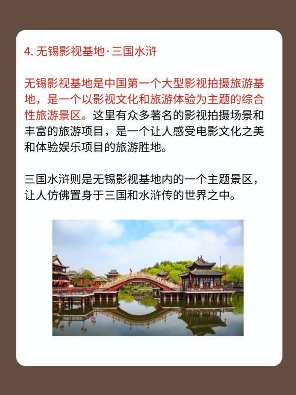 无锡影视基地是中国第一个大型影视拍摄旅游基地,是一个以影视文化和旅游体验为主题的综合性旅游景区。这里有众多著名的影视拍摄场景和丰富的旅游项目,是一个让人感受电影文化之美和体验娱乐项目的旅游胜地。三国水浒则是无锡影视基地内的一个主题景区,让人仿佛置身于三国和水浒传的世界之中。