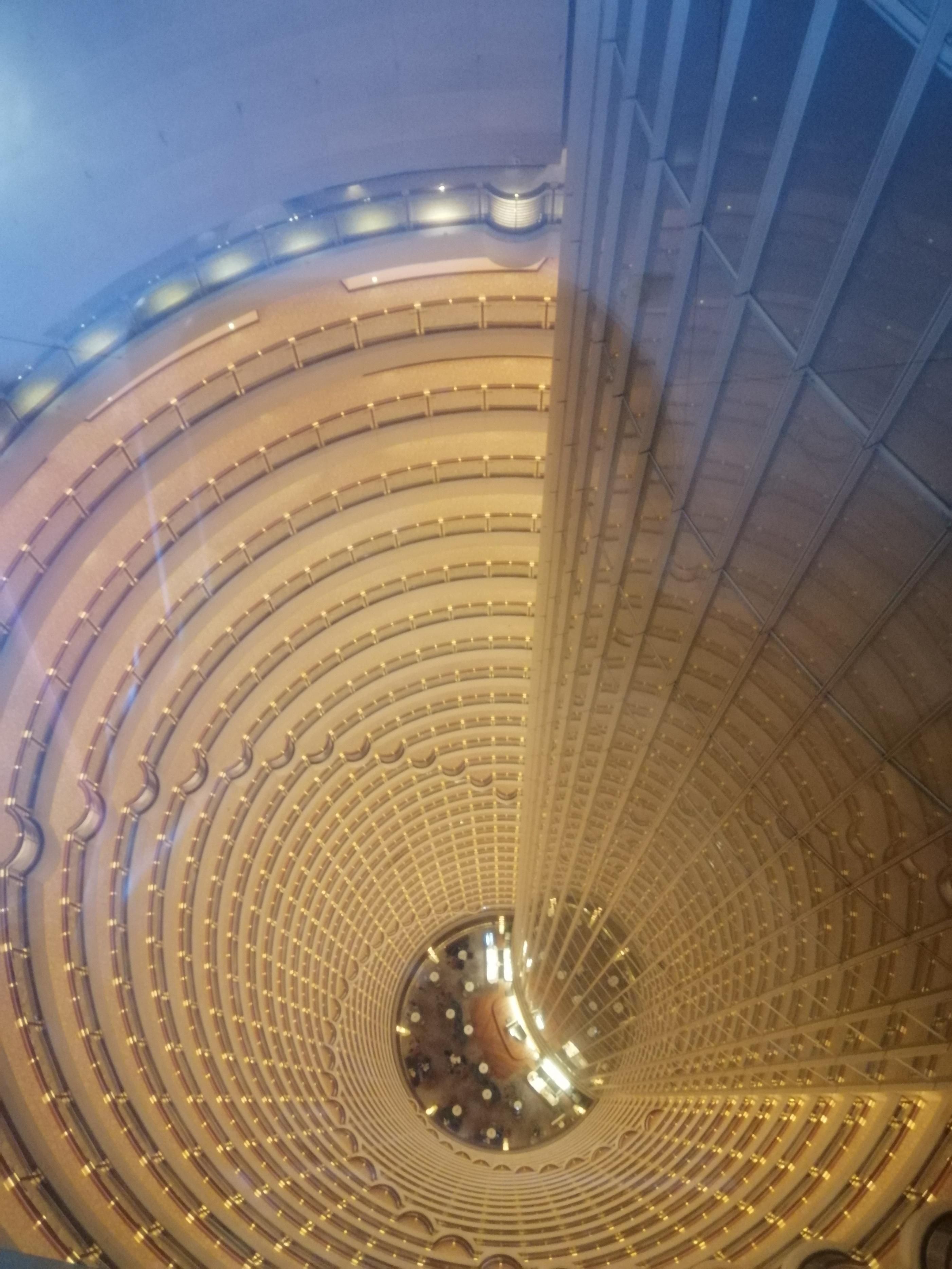 到上海的第一个落脚点,就是金茂大厦,直接45秒登上88层的高楼,从下俯瞰整个黄浦江和外滩,因天气的缘故,一片朦胧,迷迷糊糊的状态,没有内景好看!