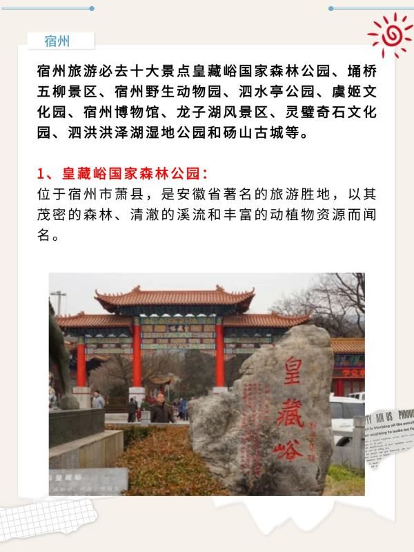 宿州旅游必去十大景点皇藏峪国家森林公园、埇桥五柳景区、宿州野生动物园、泗水亭公园、虞姬文化园、宿州博物馆、龙子湖风景区、灵璧奇石文化园、泗洪洪泽湖湿地公园和砀山古城等。