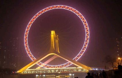 天津之眼摩天轮:天津之眼摩天轮位于北辰区的海河畔,是天津的地标之一。夜晚时分,摩天轮上的灯光璀璨,从高处俯瞰整个城市的夜景,非常壮观。在摩天轮上可以欣赏到天津市区的灯火辉煌,感受到城市的魅力。