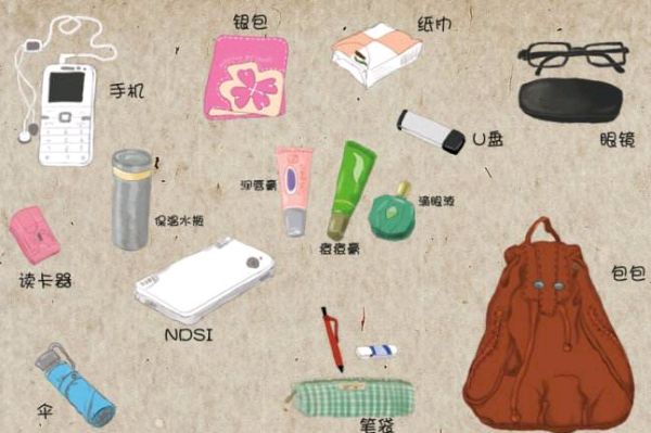 湿纸巾、润唇膏、剃须刀、卫生纸、防晒霜、梳子、手电、火机、雨伞、电池、塑料袋、垃圾袋、水壶、小刀、指甲刀、镜子、卫生用品、护肤用品、洗涑用品。