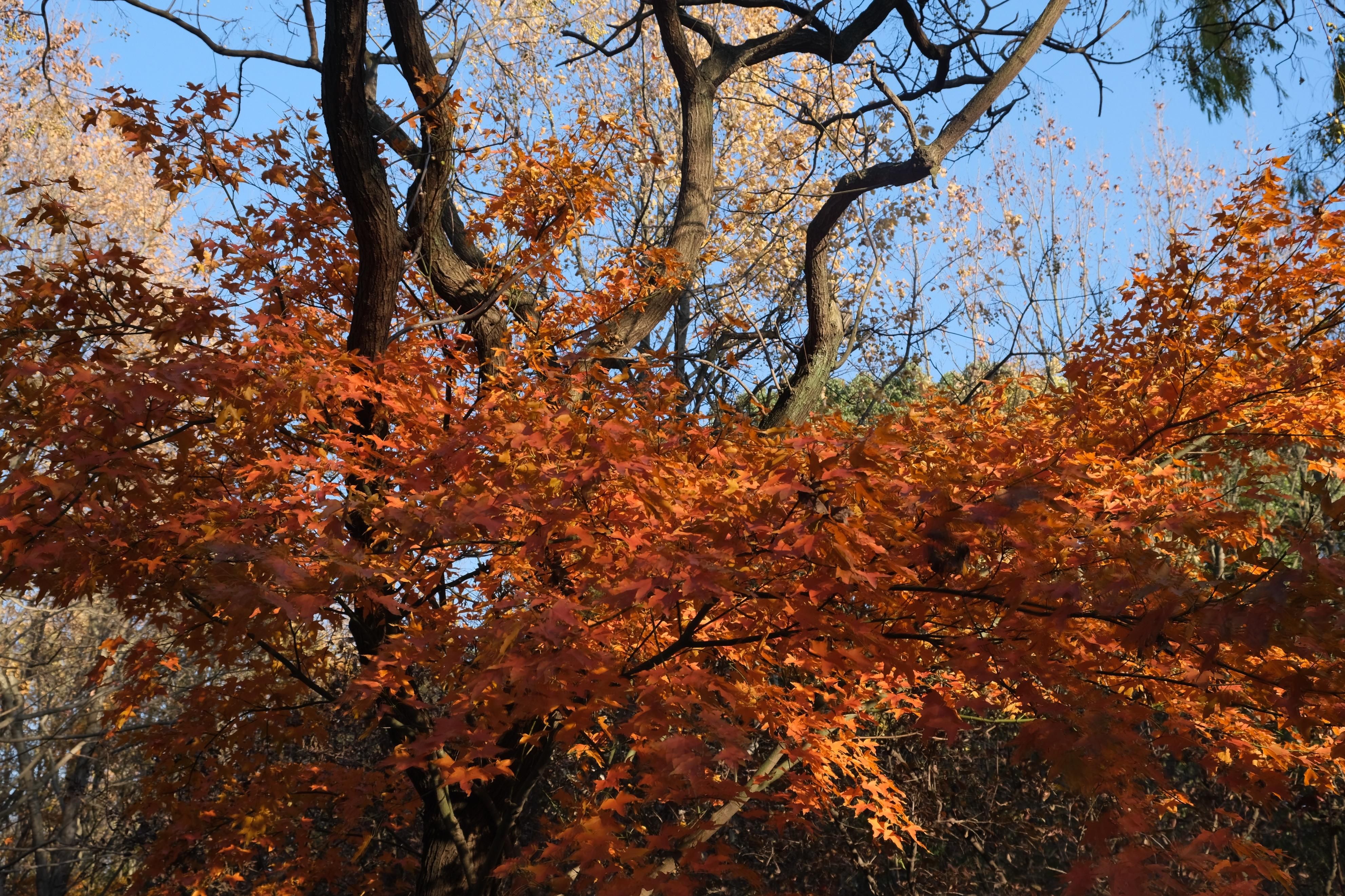 一进入森林公园,你会被满山遍野的火红叶所吸引。它们在冬日的阳光下熠熠生辉,如同一群舞者在风中翩翩起舞。每一片叶子都像是在告诉我们,即使在寒冷的冬天,生命依然可以如此绚烂。冬天的阳光穿过稀疏的云层,把金黄色的光芒洒在红叶上,使得整个景色更加迷人。