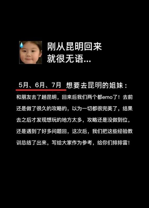 5月、6月、7月想要去昆明的姐妹:和朋友去了趟昆明, 回来后我们两个都emo了!去前还是做了很久的攻略的,以为一切都很完美了,结果去之后才发现想玩的地方太多,攻略还是没做到位,还是遇到了好多问题回,这次后,我们把这些经验教训总结了出来,写给大家作为参考,给你们排排雷!