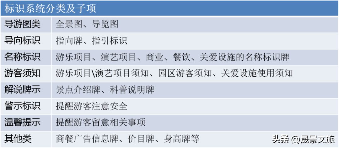 实际使用中,大部分旨在向游客传递信息资讯的都被纳入了标识系统,包括导游图类、导向标识、名称标识、游客须知、解说牌示、警示标识、温馨提示以及其他类,所含子项如下表所示: