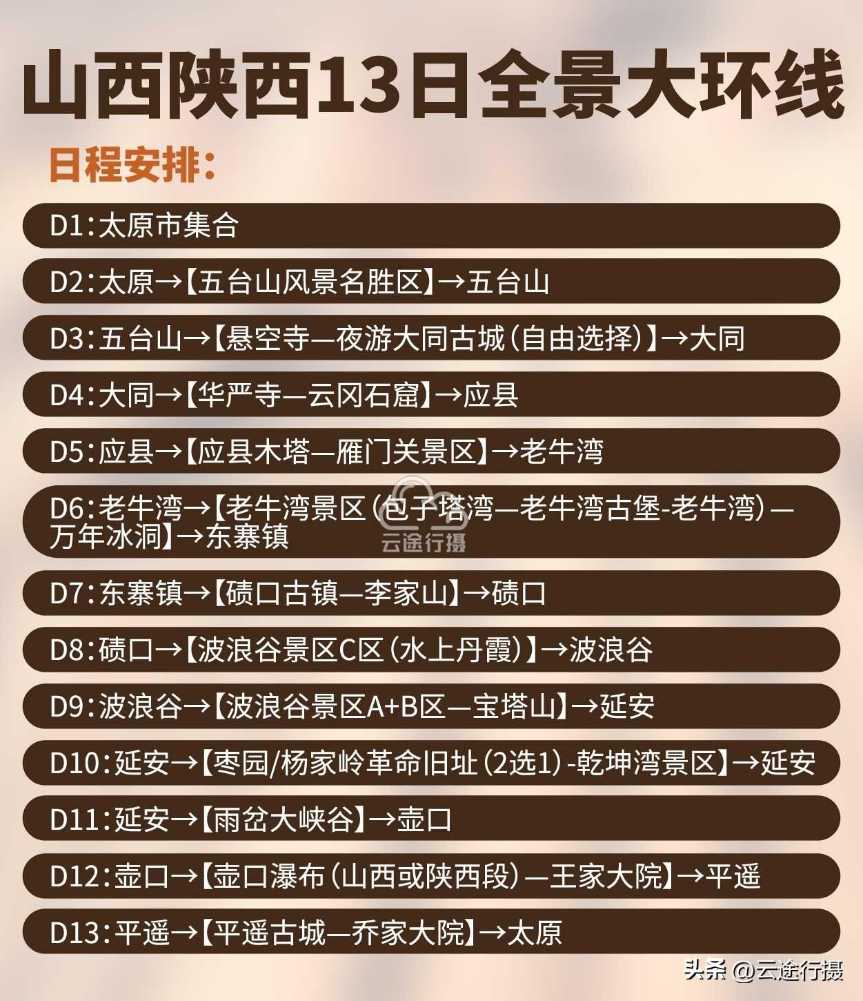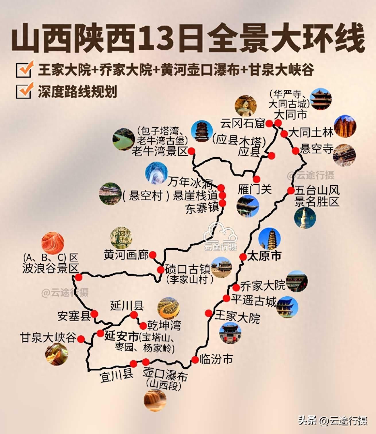山西陕西连线全景13日大环线旅游路线图攻略,深入陕西山西两省小众旅行地山西王家大院、乔家大院、平遥古城、雁门关、大同古城,万年冰洞、陕西甘泉大峡谷、黄河壶口瀑布、波浪谷、甘泉大峡谷、乾坤湾等多个特色景区,含包车旅游线路地图设计(原创);
