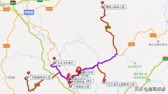 350省道-355国道-古水河风景区。全长20.3公里,车程25分钟;