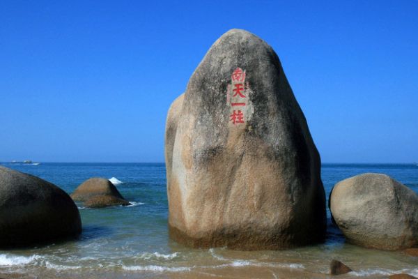 海滩上耸立着许多形态各异的岩石,其中有名的是刻有“天涯”和“海角”两块巨石,它们一直被视为爱情的象征,也是三亚标志性的景观之一。