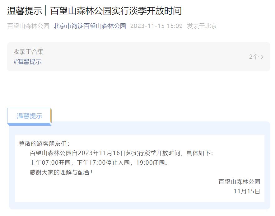 百望山森林公园自2023年11月16日起实行淡季开放时间。
