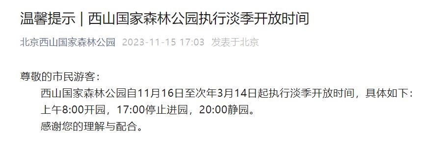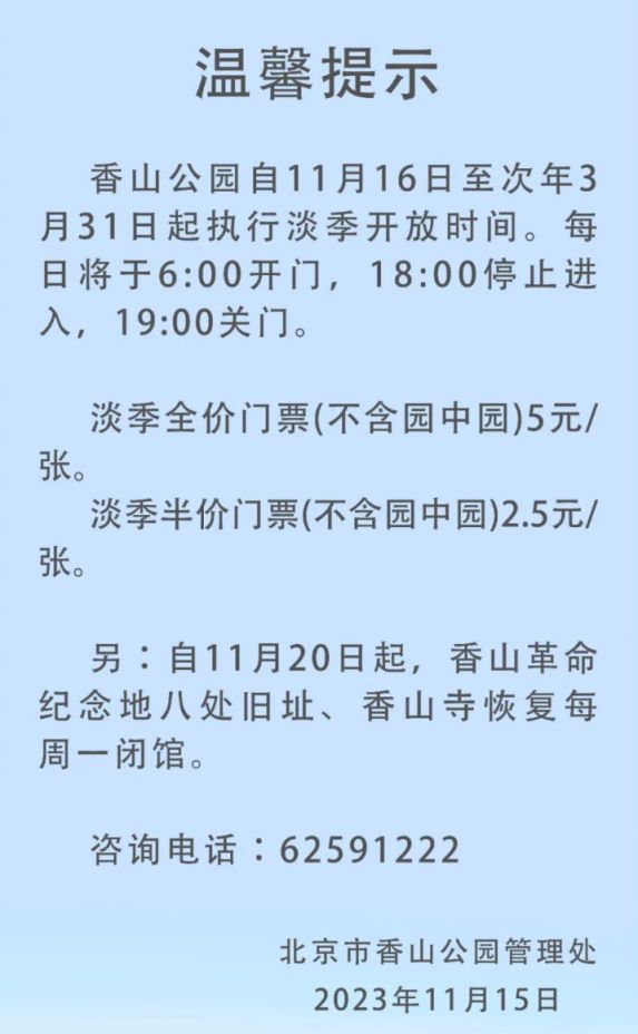 香山公园自11月16日至次年3月31日起执行淡季开放时间。