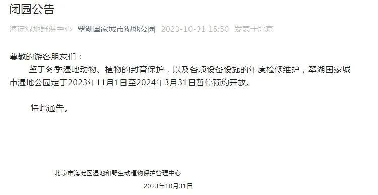 鉴于冬季湿地动物、植物的封育保护,以及各项设备设施的年度检修维护,翠湖国家城市湿地公园定于2023年11月1日至2024年3月31日暂停预约开放。