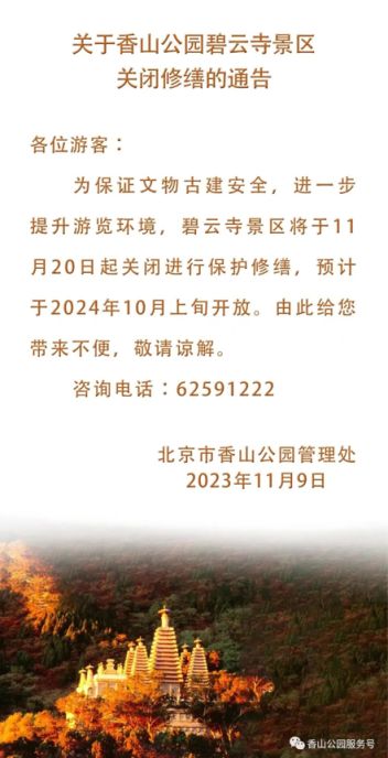 碧云寺景区将于11月20日起关闭进行保护修缮,预计于2024年10月上旬开放。红叶岭、青龙谷等所有景区暂停接待社会游客,具体开园时间另行通知。