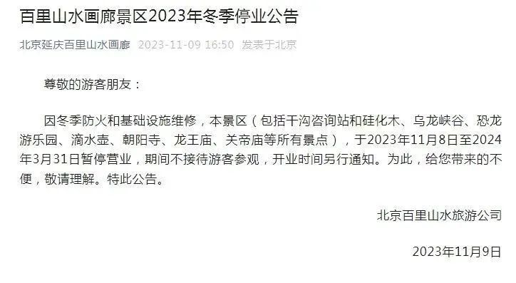 八达岭国家森林公园自2023年11月1日至2024年5月31日封山闭园,红叶岭、青龙谷等所有景区暂停接待社会游客,具体开园时间另行通知。