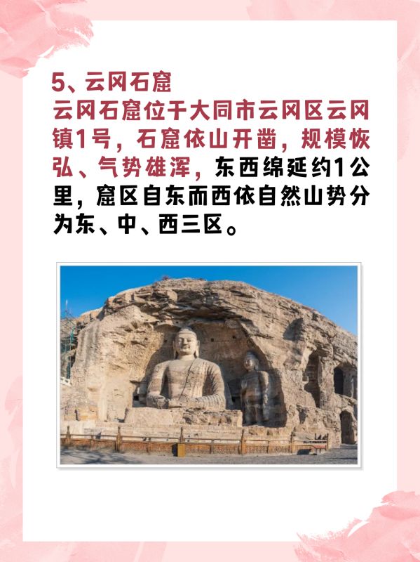 5、云冈石窟:石窟依山开凿,规模恢弘、气势雄浑,东西绵延约1公里。