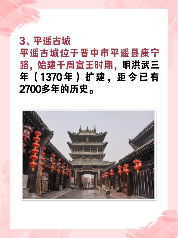 3、平遥古城:平遥古城位于晋中市平遥县康宁路,距今已有2700多年的历史。