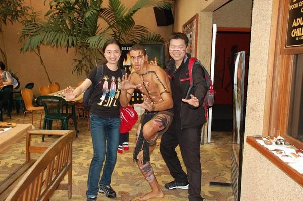 卡恩斯: 第三天一早,我们搭乘澳洲国内航班从悉尼飞往卡恩斯。我们把雨水带给了澳大利亚,但是大堡礁貌似不能出航了。好吧,做人要乐观就当为下次来澳洲找个理由。抵达凯恩斯已经是中午了,吃完午饭。我们去观看当地土著居民的表演,好吧我承认我英语比较poor,基本没听懂他们说什么。我老婆说他们口音比较重,的确很难听懂(稍稍找回自信),唯一觉得好玩的是结束的时候,土著人给我们脸上花花纹。