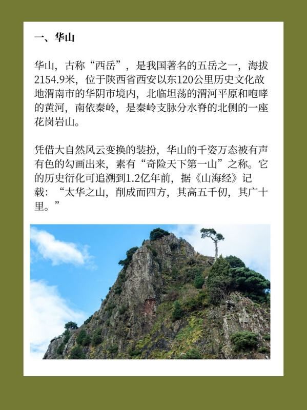 华山是中国最著名的五岳之一,也是陕西省最著名的旅游景点之一。位于渭南市华阴市境内,是与泰山、嵩山、衡山、恒山并列的中国五岳之一,以险峻著称,是中国古代文学作品中的重要题材之一。