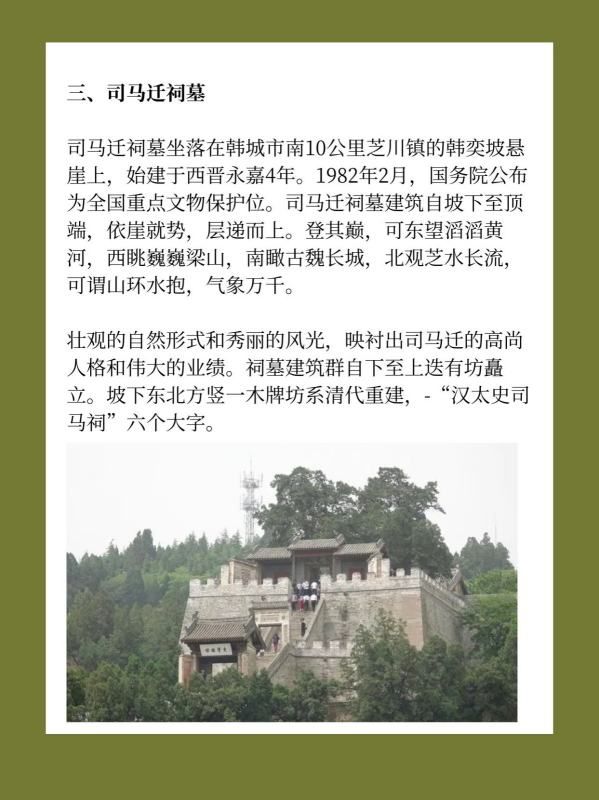 司马迁祠墓坐落在韩城市南10公里芝川镇的韩奕坡悬崖上,始建于西晋永嘉4年。1982年2月,国务院公布为全国重点文物保护位。司马迁祠墓建筑自坡下至顶端,依崖就势,层递而上。登其巅,可东望滔滔黄河,西眺巍巍梁山,南瞰古魏长城,北观芝水长流,可谓山环水抱,气象万千。