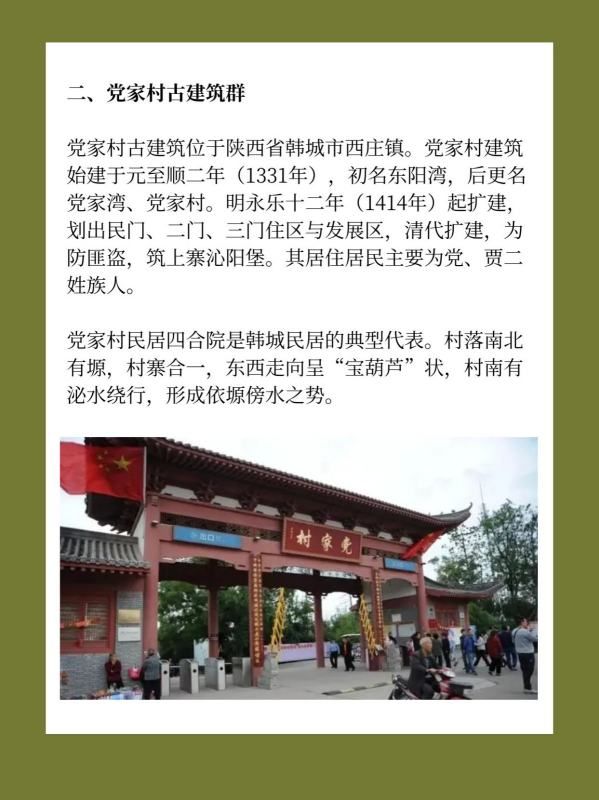 党家村古建筑位于陕西省韩城市西庄镇。党家村建筑始建于元至顺二年(1331年),初名东阳湾,后更名党家湾、党家村。明永乐十二年(1414年)起扩建,划出民门、二门、三门住区与发展区,清代扩建,为防匪盗,筑上寨沁阳堡。其居住居民主要为党、贾二姓族人。