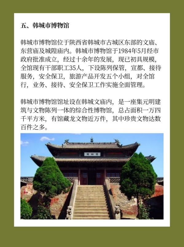 韩城市博物馆位于陕西省韩城市古城区东部的文庙、东营庙及城隍庙内。韩城市博物馆于1984年5月经市政府批准成立,经过十余年的发展,现已初具规模,全馆现有干部职工35人,下设陈列保管,宣都、接待服务,安全保卫,旅游产品开发五个小组,对全馆行,业务、接待、安全保卫工作实施全面管理。