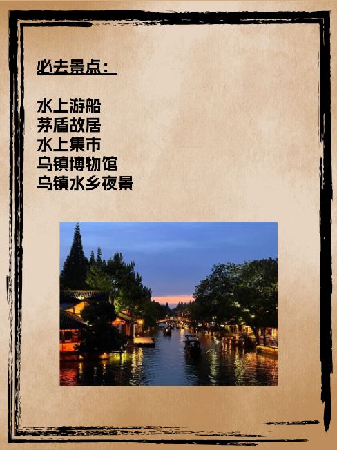 水上集市:乌镇的水上集市是当地非常著名的景点,也是一个充满古色古香的地方。在这里,游客可以欣赏到许多古老的船只和传统的水乡建筑,还可以品尝到当地的美食和特色小吃。