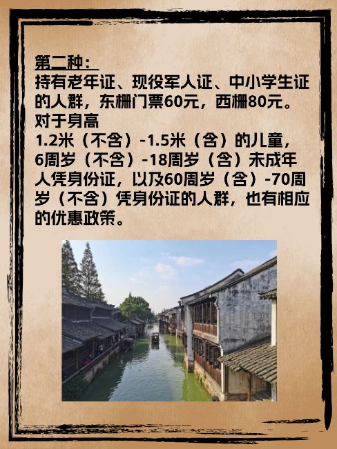 对持有老年证(无证的,凭身份证70岁以上)、现役军人证、中小学生证的人群,东栅门票60元,西栅80元。对于身高1.2米(不含)-1.5米(含)的儿童,6周岁(不含)-18周岁(含)未成年人凭身份证,以及60周岁(含)-70周岁(不含)凭身份证的人群,也有相应的优惠政策。