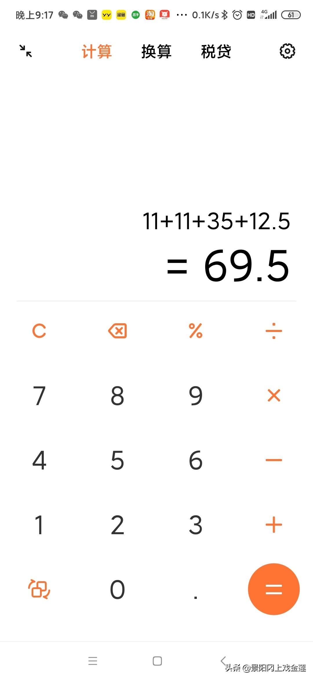 最后来一张开销,早11,午11,晚35水加红牛12.5,总共,等我用计算器算一下:69.5你们看错。计算器不能更改模式。大家都睡吧明天继续。