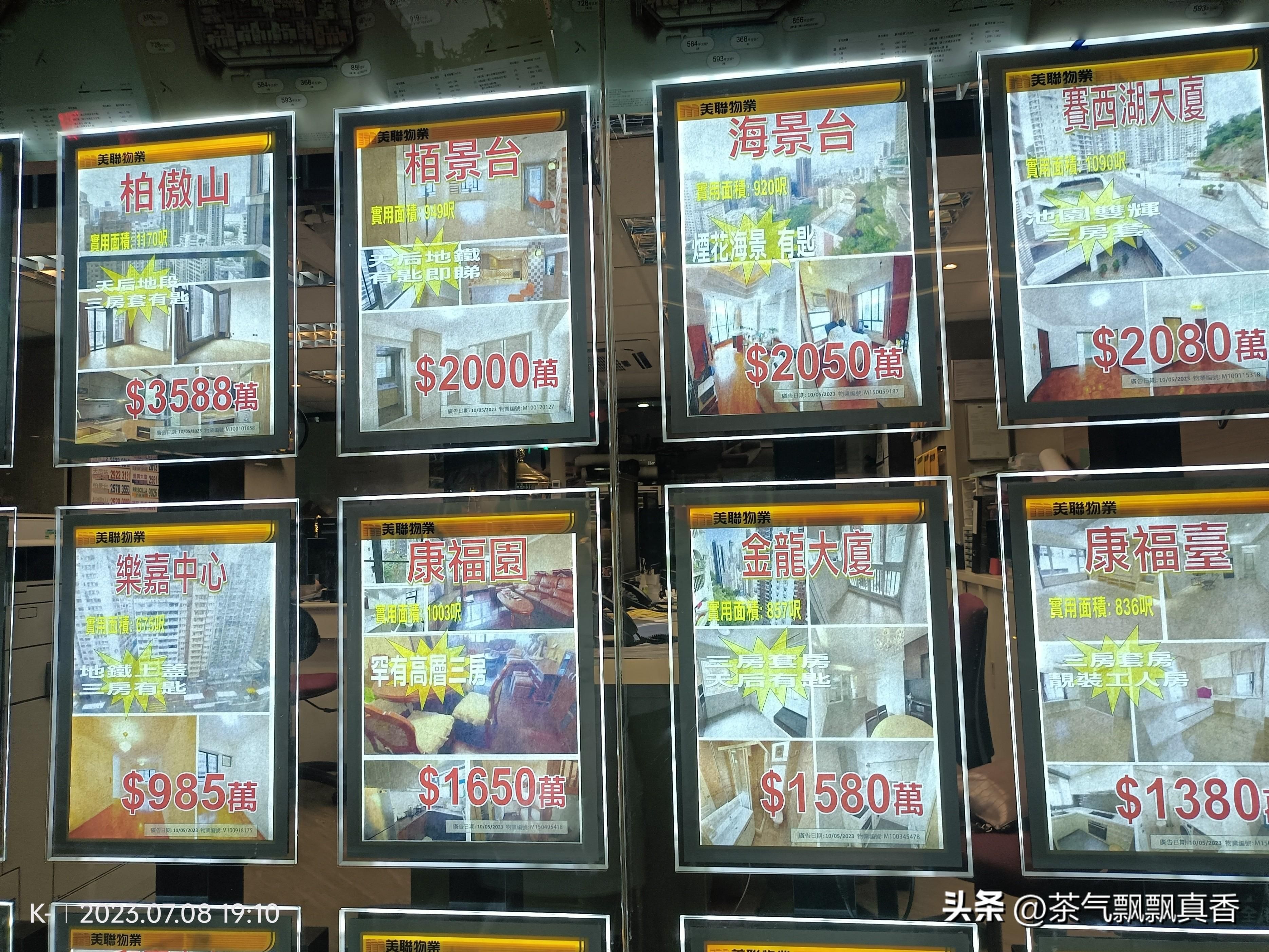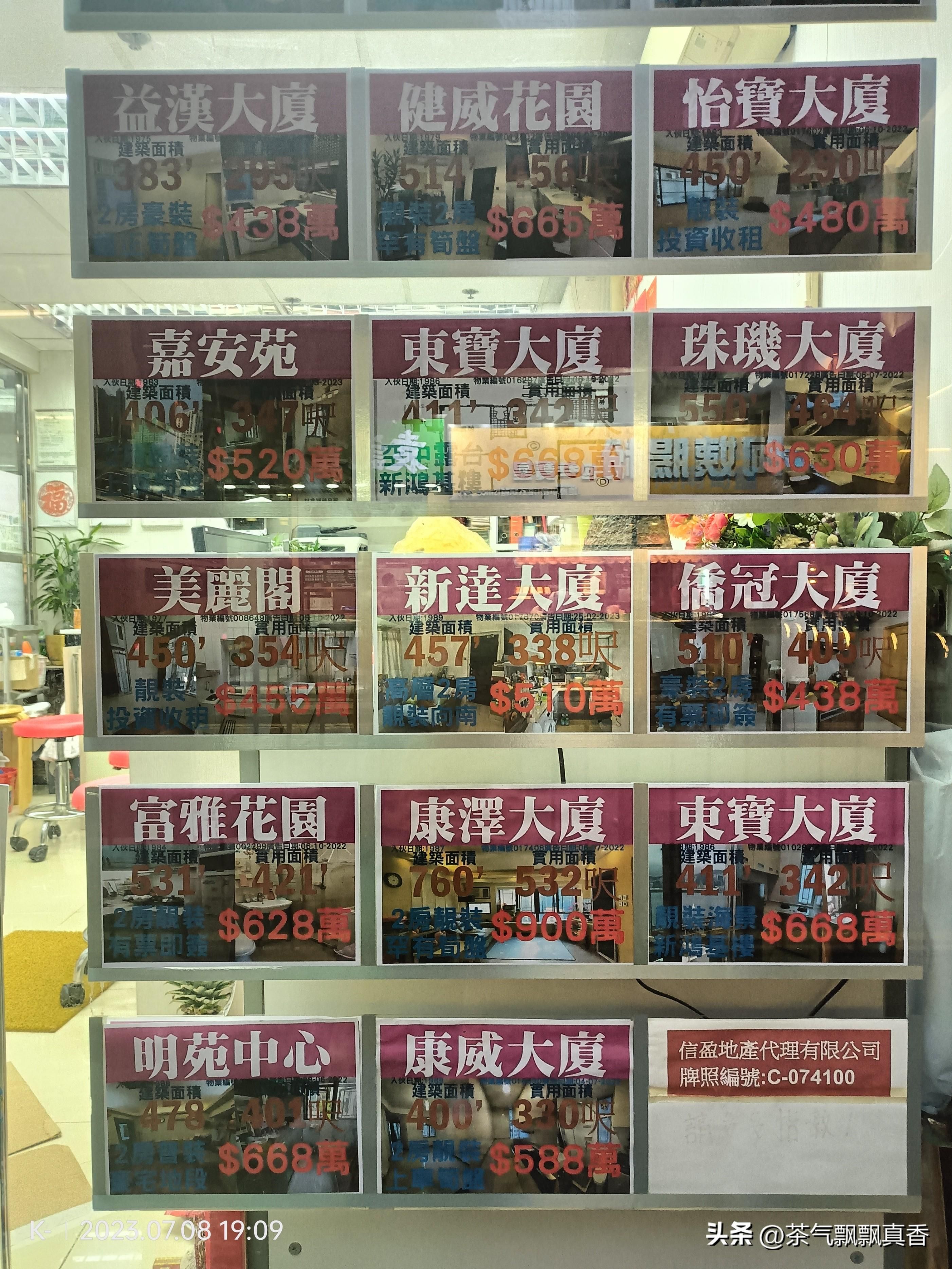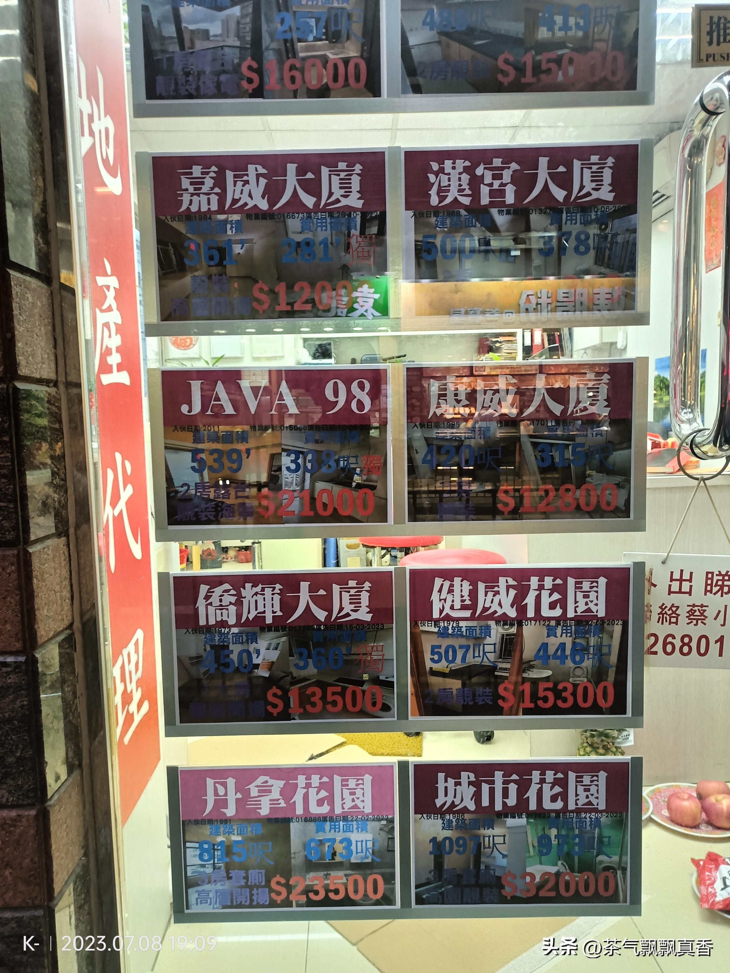 先给你们看看我在尖沙咀街头随手拍的两家房屋中介的橱窗上贴的房屋租售价格吧!