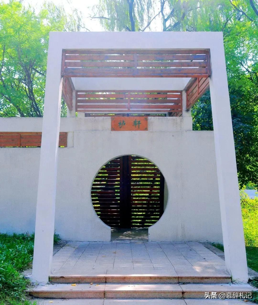 栌轩寓意“高远、清雅、舒适、自然”,与红石公园的自然环境相得益彰。入口采用中式园林圆形拱门,又称“月洞门”,营造出一种“圆中有景,景中有圆”的视觉效果。拱门前方,一条精致的木质廊架延伸至顶部,巧妙的融入了周围环境,光与绿景半遮半掩,引人入胜。