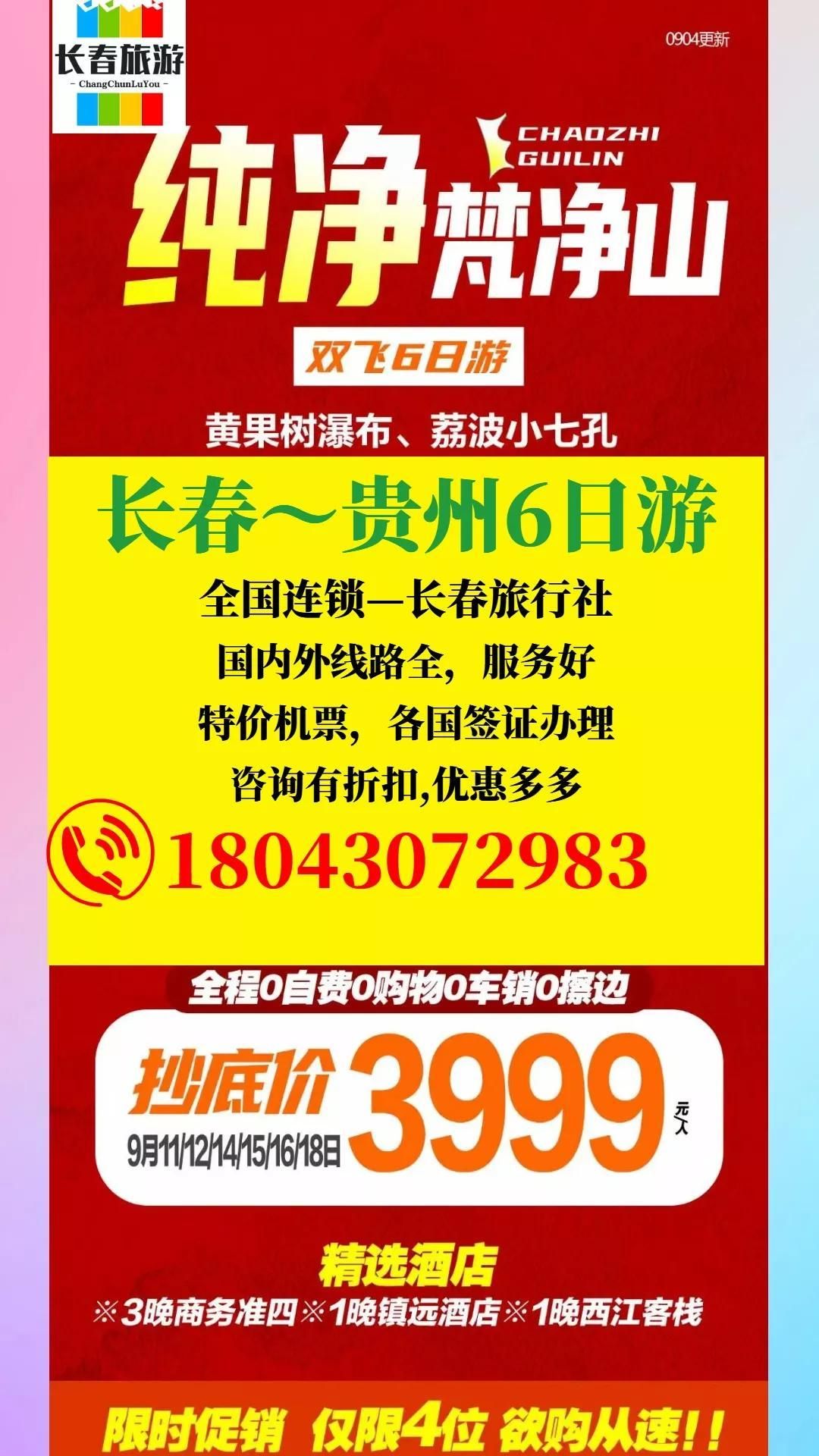 亲爱的长春旅行者们,贵州的旅游不仅让您放松身心,更能让您重新找回内心的平静和净化。请抓住这个难得的机会,加入我们的旅游团,一起走进贵州的怀抱,感受大自然的神奇魅力吧!