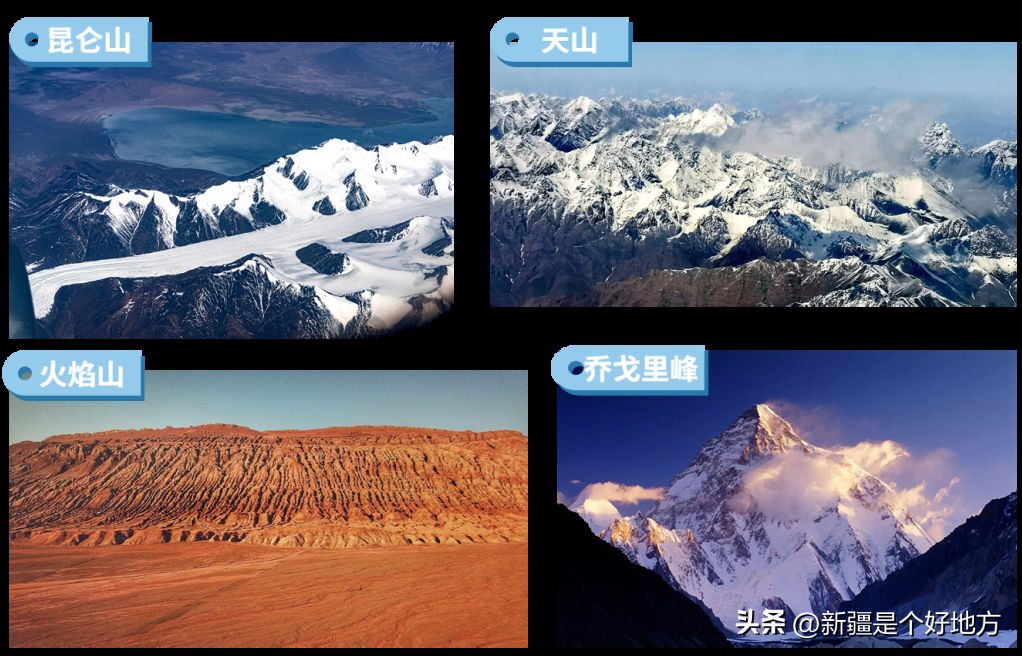 山有万山之祖昆仑山,世界自然遗产天山,世界第二高峰乔戈里峰,我国最炎热的山火焰山;