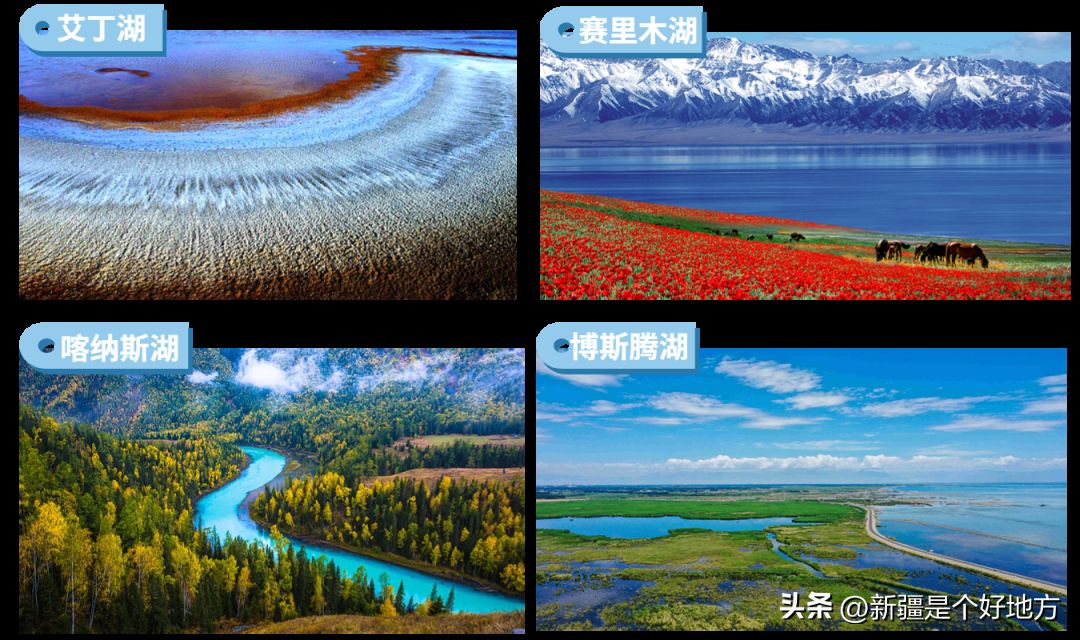 湖有我国最大的内陆淡水湖博斯腾湖,我国海拔最低的艾丁湖,我国水位最深的冰碛堰塞湖喀纳斯湖,还有被誉为“大西洋最后一滴眼泪”的赛里木湖;