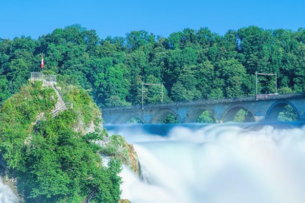 莱茵瀑布是欧洲最大的瀑布,宽150米,落差23米,平均水流量700立方米/秒。自古以来这里就是著名的观光胜地,哥德也曾撰文称赞这座优美的瀑布。而正是这个瀑布影响了船只在莱茵河上的通行,沿着莱茵河下去的船不得不先在这里把东西卸下来,沙芙豪森也就因此慢慢变成了城镇。