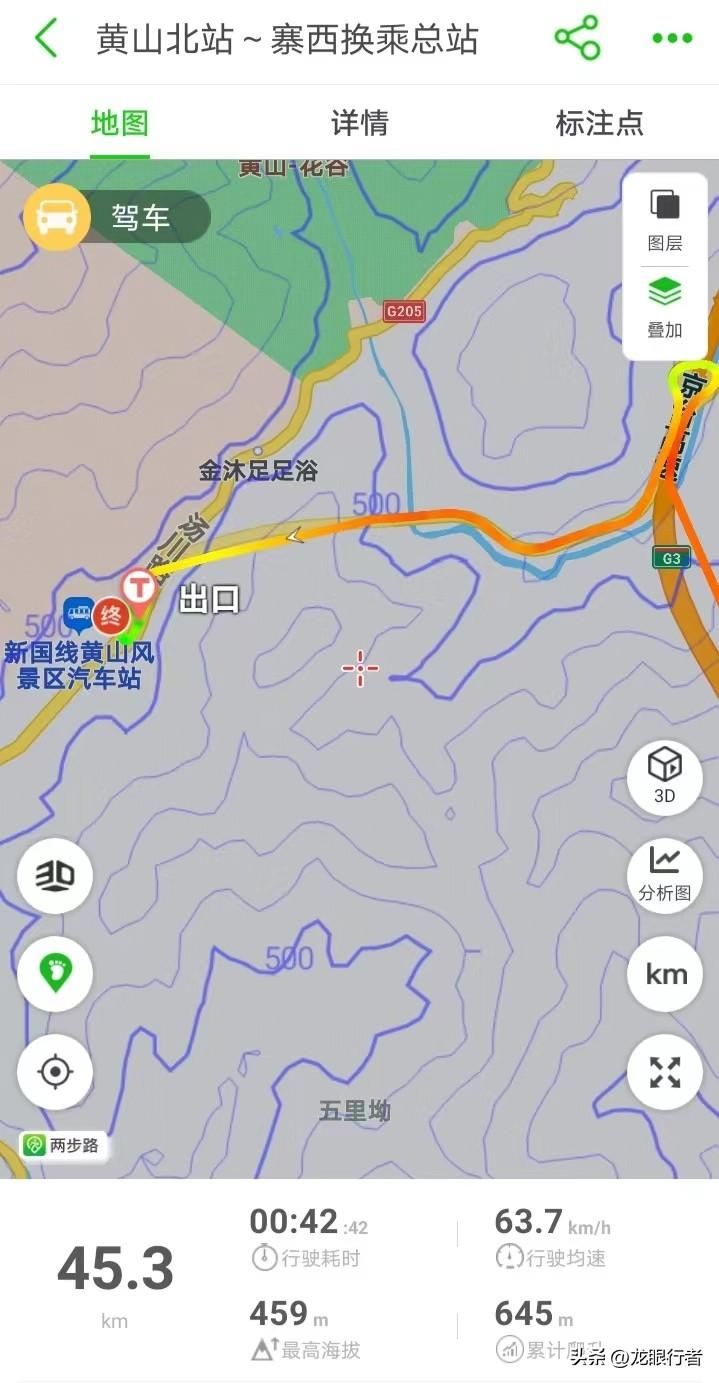 6.终点站是位于汤口镇的寨西换乘中心总站(即俗称的“黄山南大门”,地图上的标识是“新国线黄山风景区汽车站”)。全程约45公里,大约需要1小时的行驶时间。