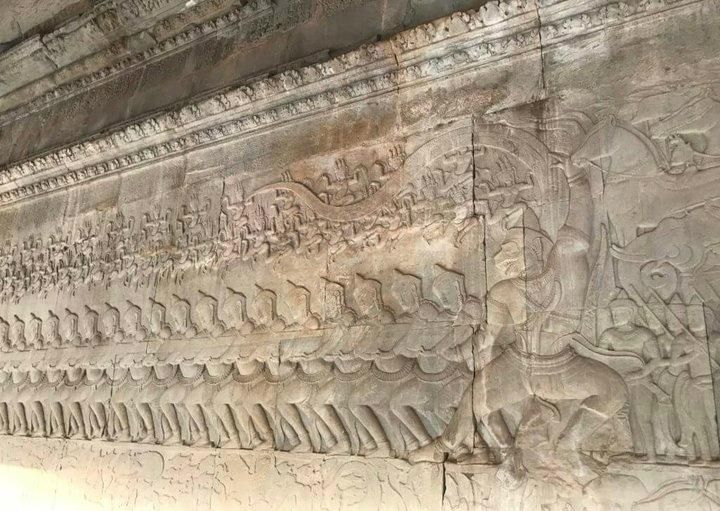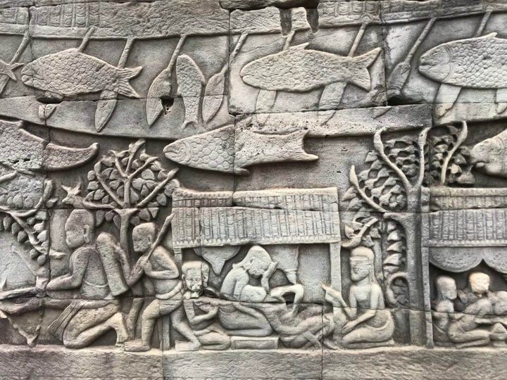 巴扬寺外墙上的浮雕非常有趣,有別於神话故事的抽象,这里雕刻的是吴哥王朝的庶民生活样貌,在满满的浮雕中你能找出渔民出海补鱼、赛猪公、妇人生产的图像吗?