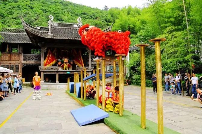 4.在南山竹海历史文化区,你可以看一场民风味实足的舞狮表演,洗去城市里的烦躁浮华,欣赏鸡鸣村的情韵,自有一番滋味。村子里头搭了戏台,戏台前头还有梅花桩,应该算是非常专业的舞狮表演了。开始在台上的表演中规中矩,大多数人觉得有意思,但也称不上非常惊艳,没想到上了梅花桩,舞狮表演变得如此生动。