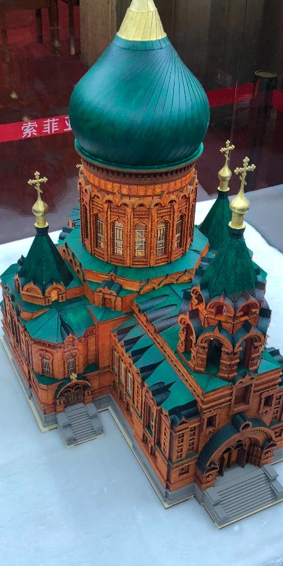 索菲亚教堂微缩景观制作,经过多次对索菲亚教堂结构的实地研究,结合制作微缩景观材料的使用,设计出整体拼装结构。整体微缩景观由2100多片的木质零件组成,模型仿照真实建筑设计,外观和内部各个房间均有还原。微缩景观特色:利用不同木板厚度的特性,将外观装饰结构与建筑基体结构相结合,通过多层叠加的方式还原真实建筑结构,八边形的多层拱券及尖塔更是通过不同角度的切割素材做到完美贴合,教堂最大特色的洋葱顶采用木质龙骨与纸板外贴的方式设计,具有1:1还原的特点,此外教堂的窗子全部安装花窗贴纸,无论是外部灯光还是内部灯光都可以映射出不同图案的彩绘花纹,加强了艺术特性。