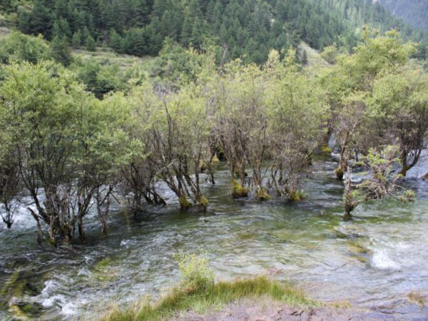 盆景滩是一片钙化浅滩,水中长着杜鹃、杨柳、松树、柏树、高山柳等喜爱水性的植物,更神奇的是每一株树下都有一个盆状的钙化堆积,千姿百态,就像天然的盆栽。
