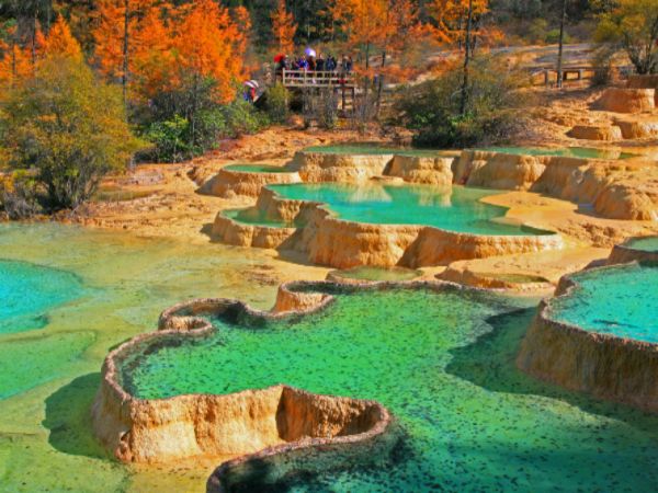 五彩池是九寨沟里最小的湖泊,但又是颜色最丰富的一个。在同一片湖泊里见到天蓝,碧蓝,榄绿等不同的颜色。天气好时,能看到蓝天白云的映在水面上。