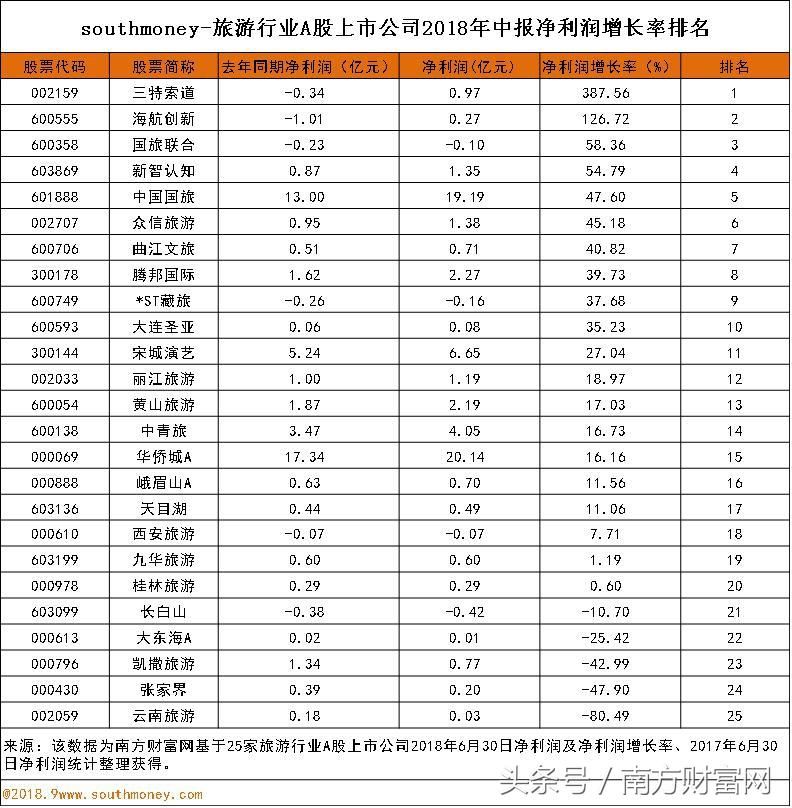 据南方财富网统计,25家旅游上市公司在2018年上半年合计实现的净利润总额为63.54亿元,同比增长27.56%。与去年同期相比,今年上半年有20家企业净利润上涨,5家下跌。其中,三特索道(002159)和海航创新(600555)净利润实现扭亏为盈,分别同比增长387.56%、126.72%,位列榜单的第一、第二名。