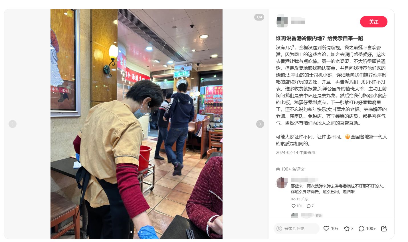 帖文吸引不少曾经游港的内地旅客留言表示“我觉得香港人真的很热情”、“大多数本地人和服务人员也礼貌友善”。