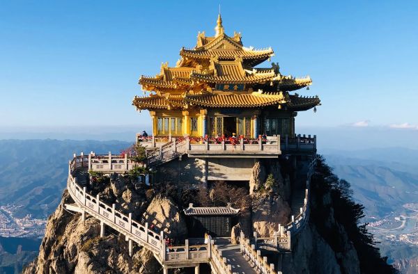 索道上站 - 金顶:如果您选择乘坐索道,那么在到达索道上站后,您将直接抵达金顶。金顶是老君山的最高点,也是整个景区的核心区域。在这里,您可以参观到壮观的金殿,这是一座供奉太上老君的殿堂,内部装饰华丽,充满了浓厚的道教氛围。
