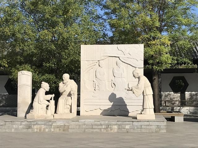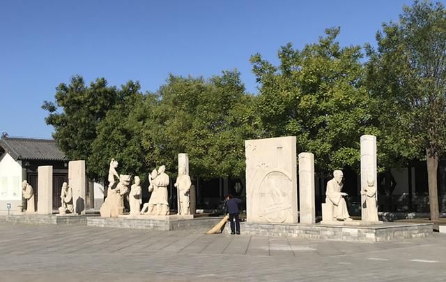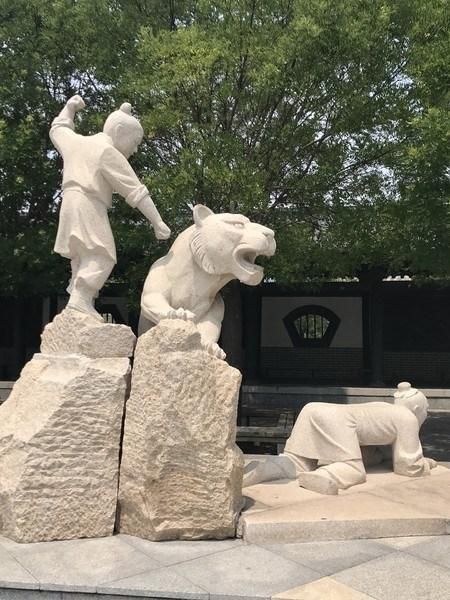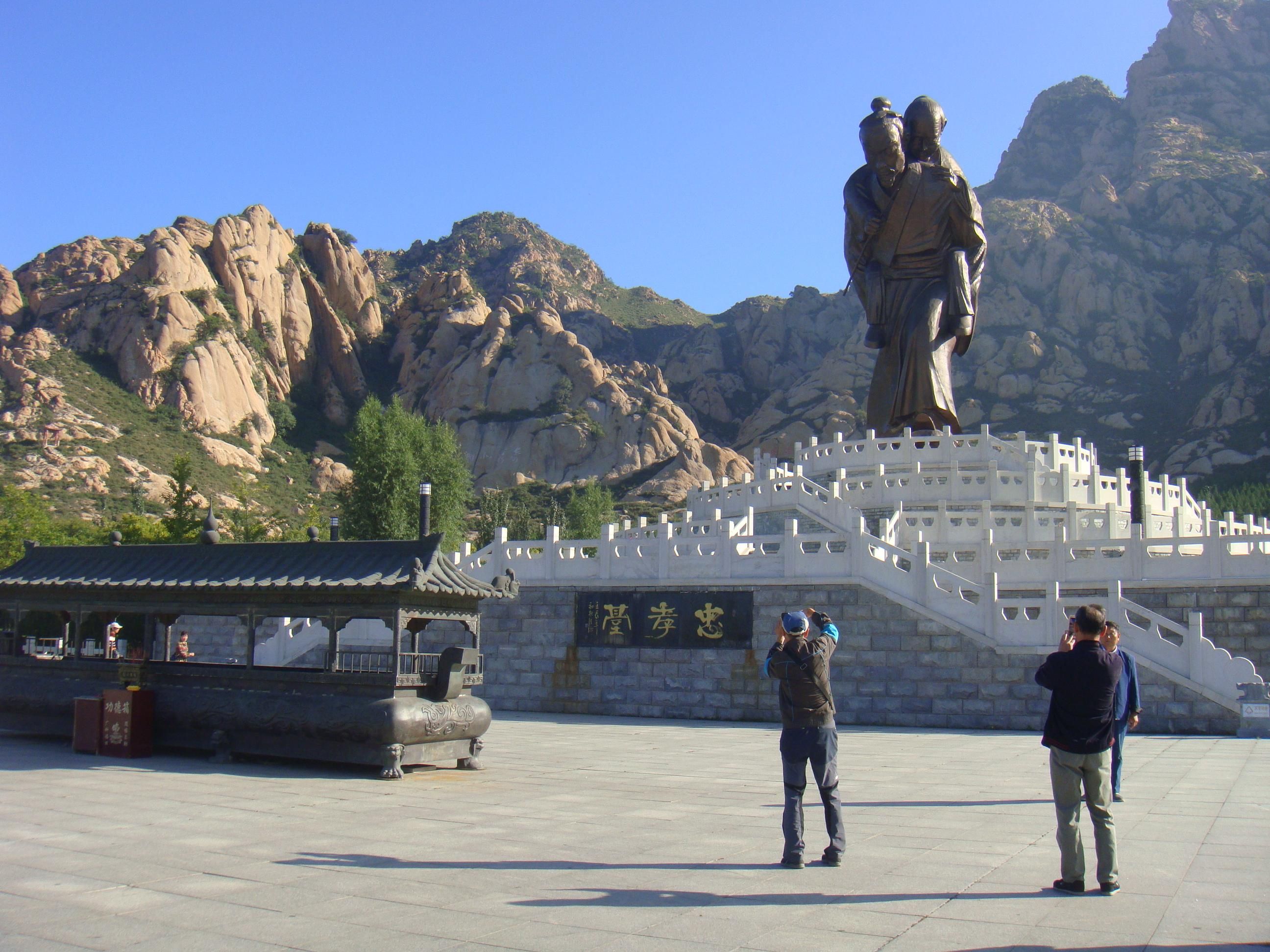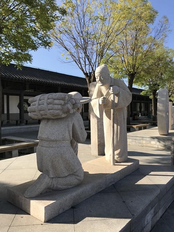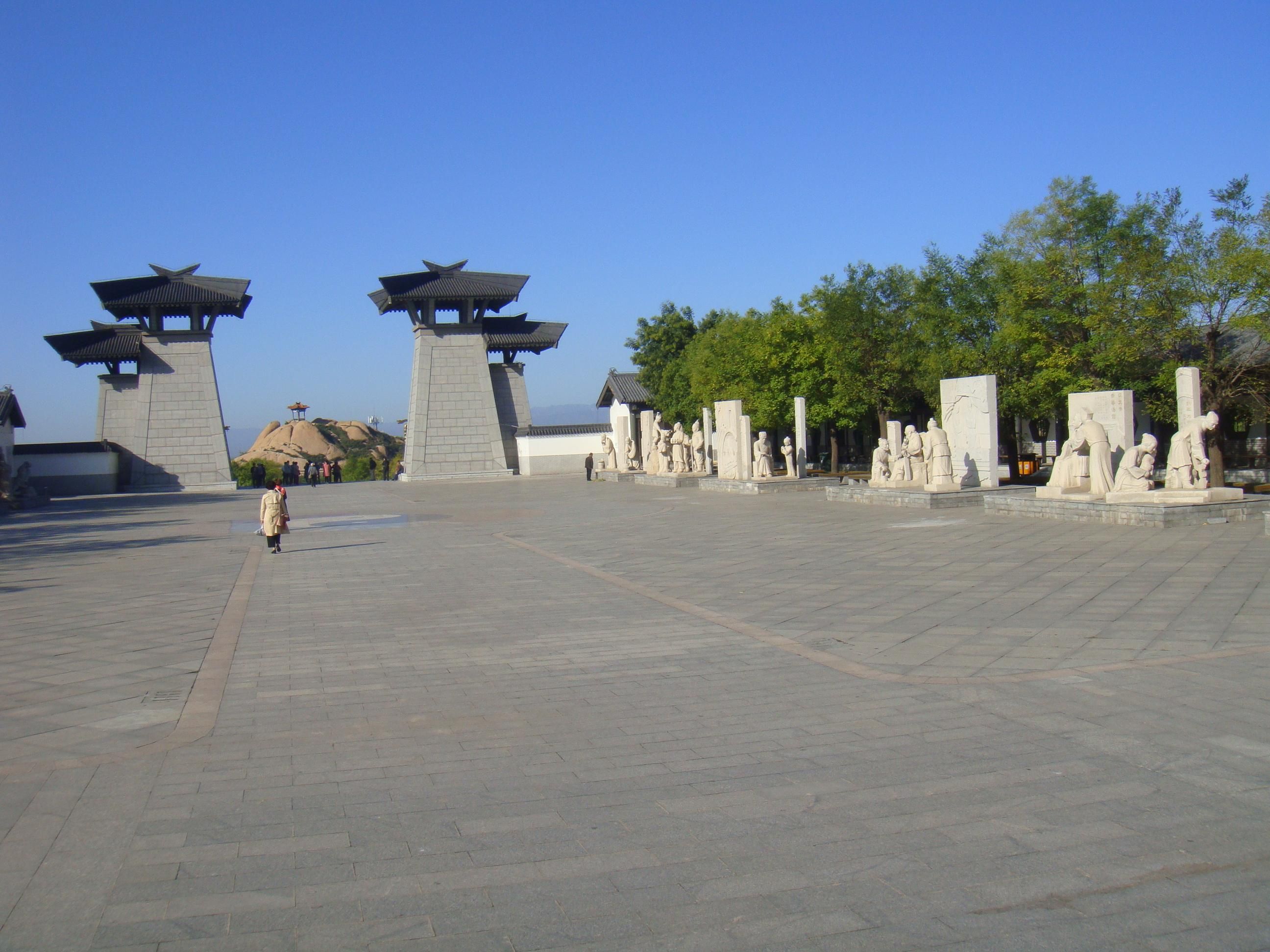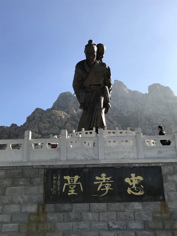 忠孝广场上两侧是四个圆形石柱,上刻“文武忠孝”四字。走上忠孝园中心广场,是忠孝台和以孝为主题的雕塑组:闻雷泣母,怀桔遗亲;扼虎救父,缇萦救父;弃官寻母,行佣供母等。